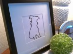 Here is a simple art project that you can make in a matter of minutes once you’ve gathered your supplies. There are many ways to make silhouette line art drawings, and this one is easy and fun! It will look great on a wall near your pet’s sleeping or eating area, also mixed in with a collage of family photos, or on a table near an entry door. I was inspired to draw this rendering of our Toby when I saw these custom pieces of art here. When I like a piece of art in a magazine, I like to see if I can make it myself and save money, too!