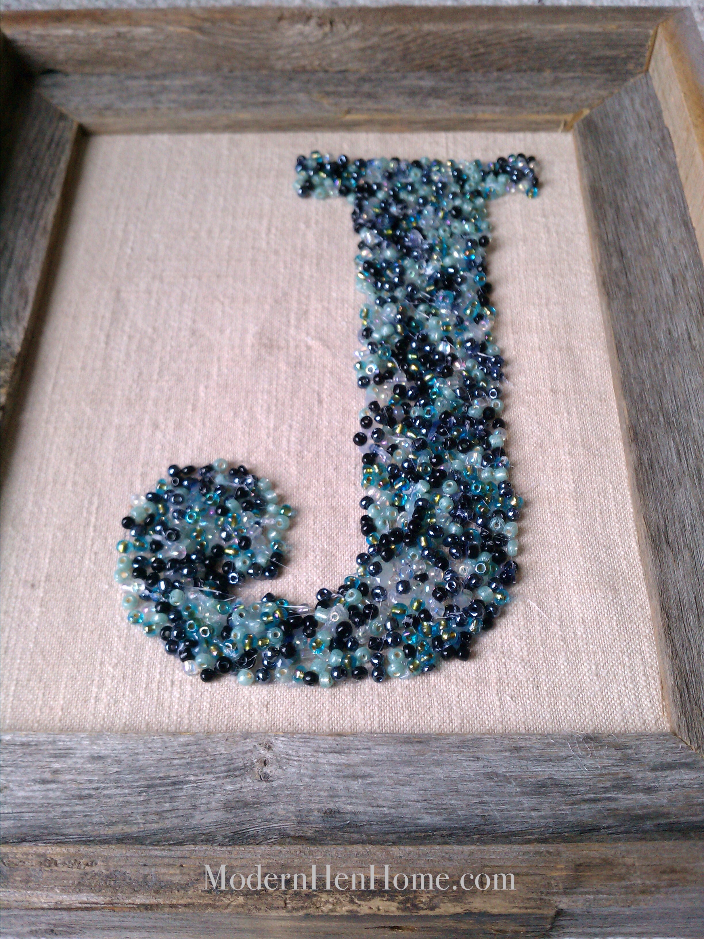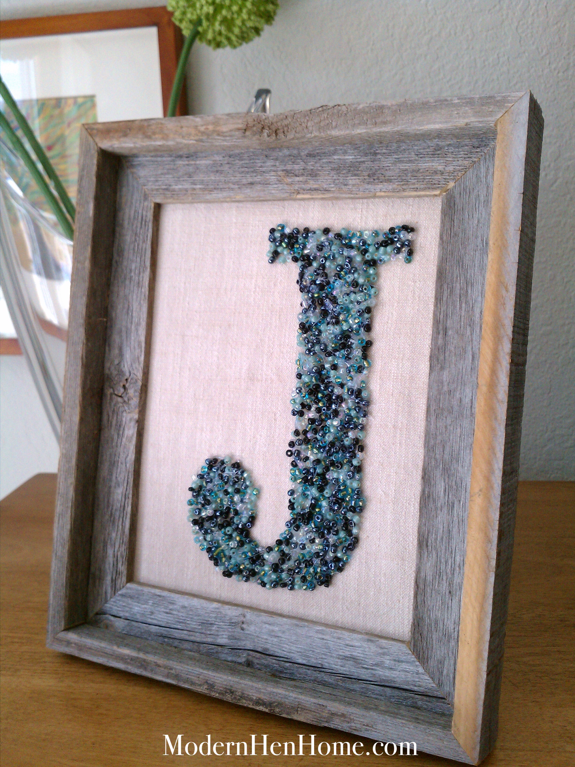 Both of these framed monograms inspired my “J” art. I decided to go with a blue monogram and use small beads instead of buttons, along with a rustic frame, so that it will work in almost any room in our house.