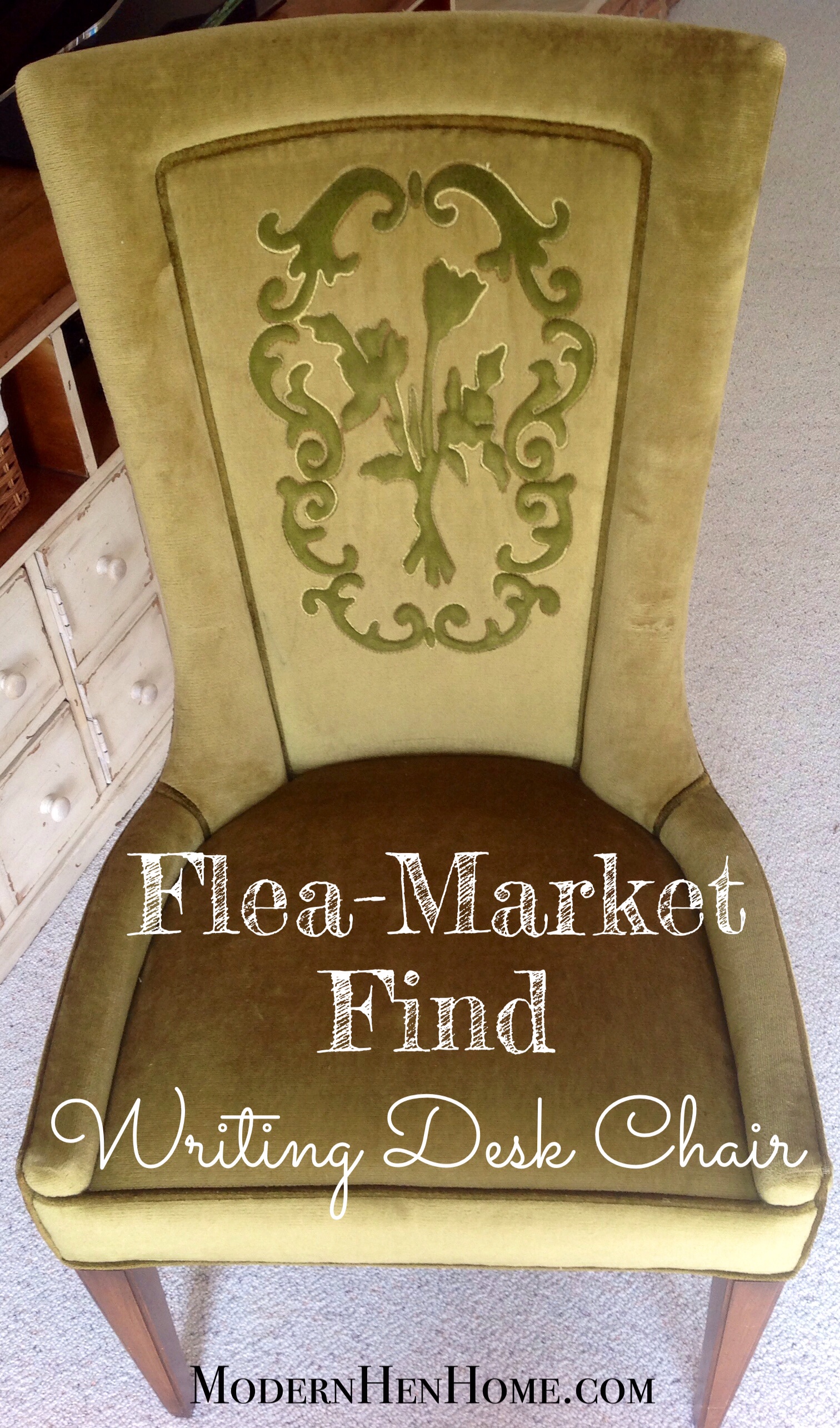 It’s not an antique, but it caught my eye. The olive green, velvet upholstery shows some wear, and that doesn’t bother me. The backrest curves forward with contrasting crewel and trim. I like stuff with a history, even if I’ll never know what that story is.
