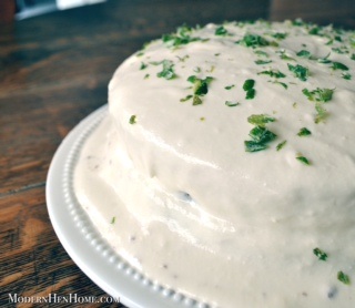 First cake will be upside down. Brush away extra crumbs and layer frosting liberally across top. Add second cake on top by easily flipping upward and move into place. Fold more frosting on top and allow to fall over the sides. Once cake is covered completely with frosting sprinkle lime zest over top. Refrigerate before serving.