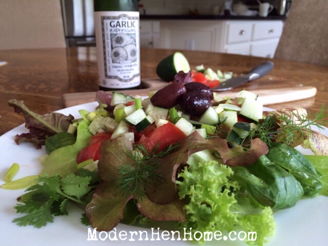 I’ve already made my first salad with clippings from the lower leaves of the plants, and tossed in a few of the herbs, diced tomatoes, cucumbers, Kalamata olives, and green onions. It was so fresh and delicious!