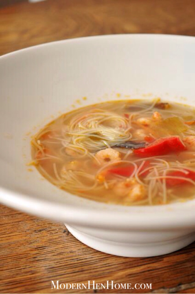 3. Add uncooked noodles and shrimp, lower heat and simmer about 2 minutes or until noodles are al dente. Remove from heat, taste for salt if needed. ModernHenHome.com