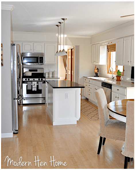 Once the cabinets were painted and the walls given a fresh coat of gray paint a friend added crown molding to the ceiling and center island for us.